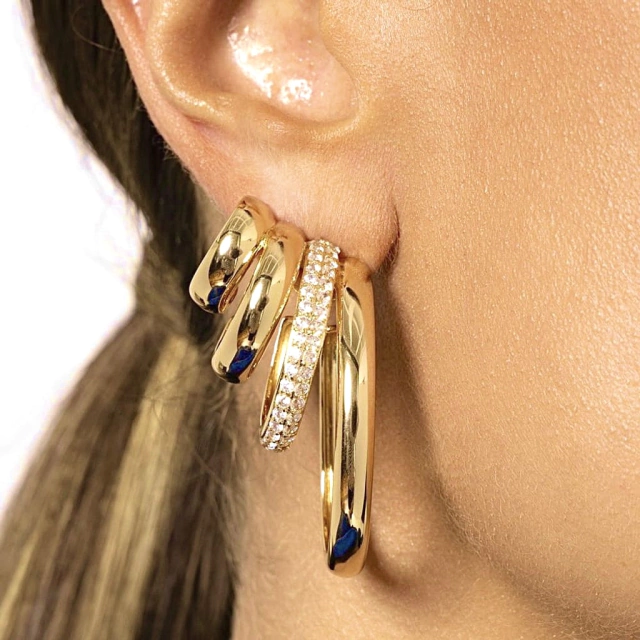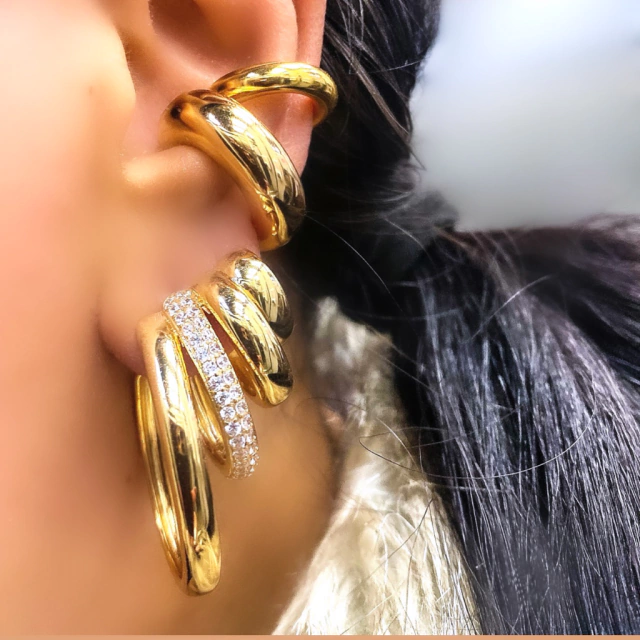 Argola banhada a ouro três voltas lisas, uma volta com duas fileiras cravejadas de zircônias brancas, super elegante e moderna.