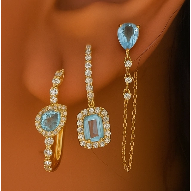 Brinco com gota Topazio Azul  e corrente cravejada em Moissanites de Prata 925 com banho de Ouro 18K