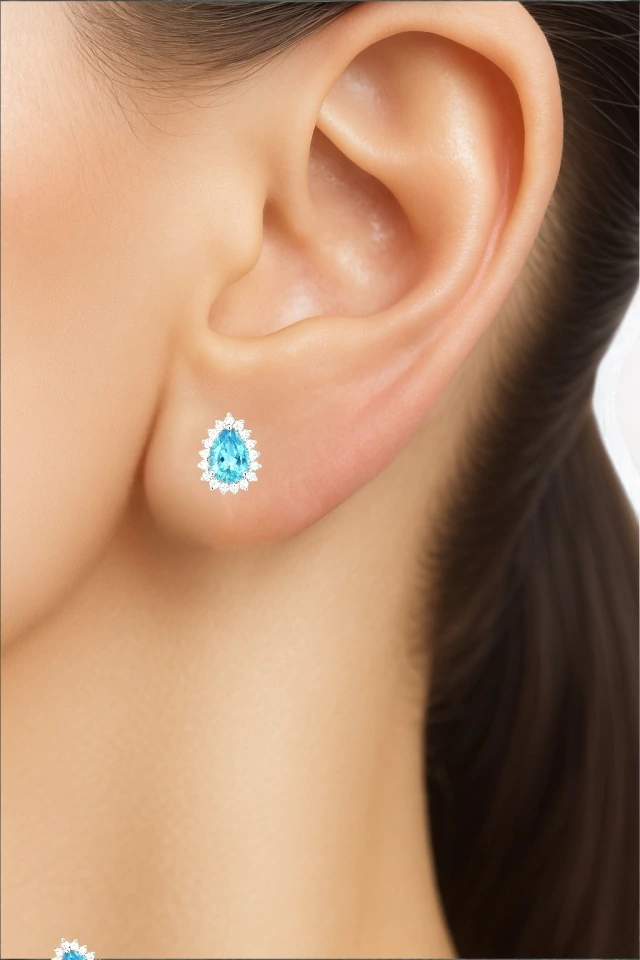 Brinco gota modelo princess topázio azul natural cravejado com Moissanites em Prata 925
