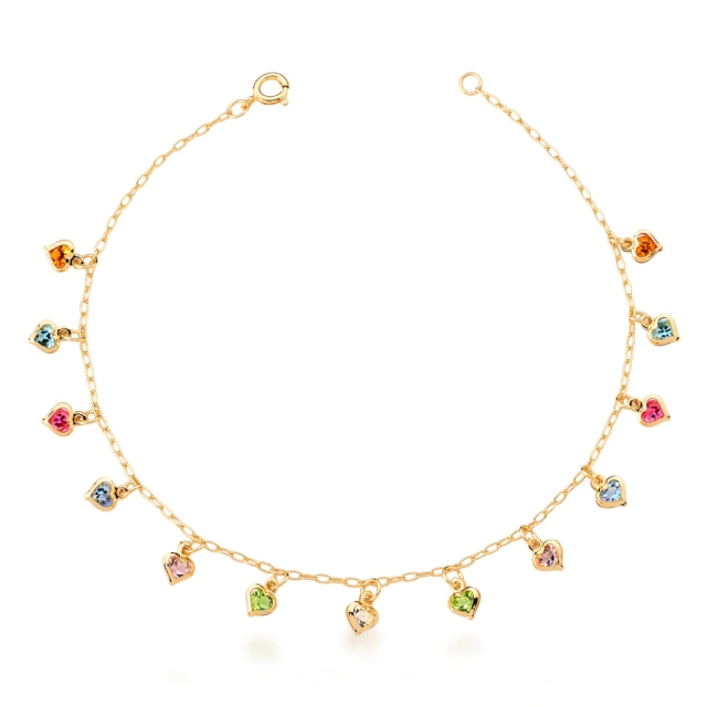 Tornozeleira com pingentes de corações em zirconias coloridas  banhada a Ouro 18K